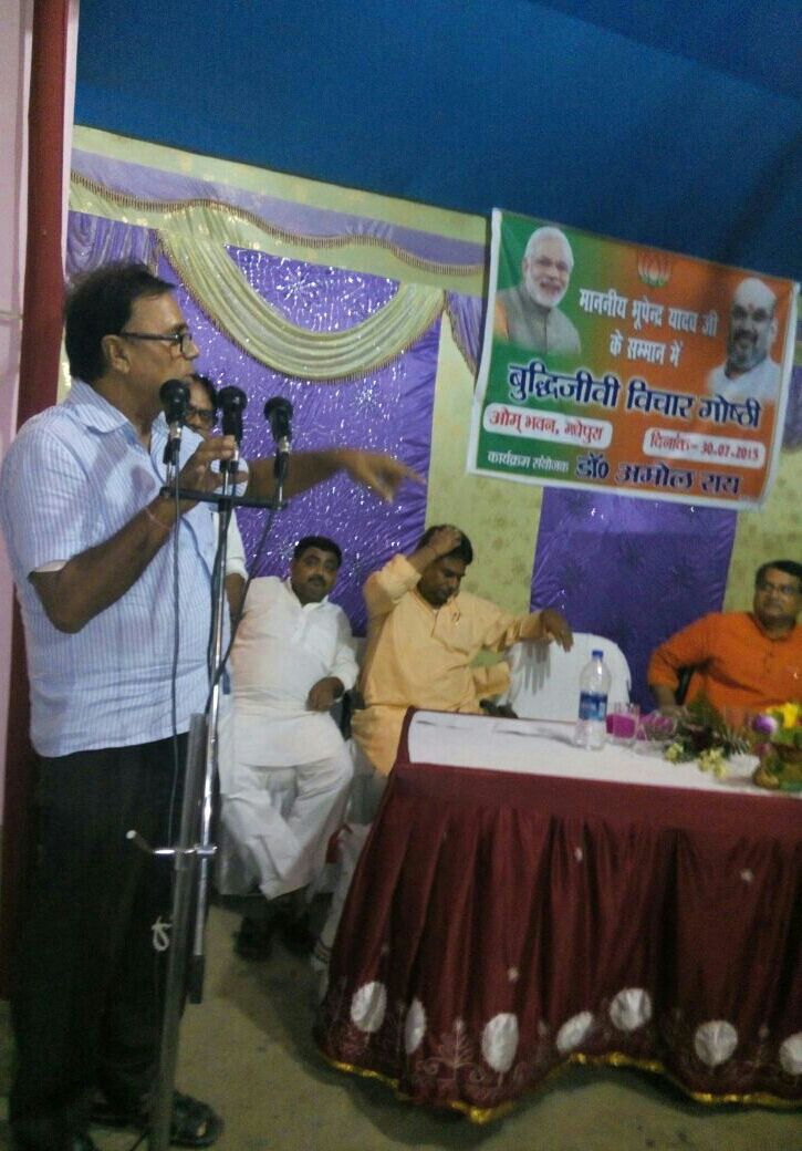 गोष्ठी में स्वगाताद्यक्ष के रूप में डॉ.अमोल राय, मंच संचालक डॉ.विनय कुमार चौधरी अच्छी खासी बुद्धिजीवियों की उपस्थिति से गद्गद् होते दिखे | शहर के सभी वर्गों के बुद्धिजीवियों की उपस्थिति प्रभारी भूपेन्द्र यादव के साथ-साथ विधान पार्षद डॉ. दिलीप जायसवाल, प्रदेश महामंत्री सूरज नंदन मेहता, प्रदेश शिक्षा मंच अद्यक्ष प्रो.अनिल यादव, कला संस्कृति मंच के प्रदेश अद्यक्ष आनंद मिश्रा, प्रदेश उपाद्यक्ष डॉ.राम नरेश सिंह, विधायक डॉ.आलोक रंजन तथा ज़िलाद्यक्ष अनिल कुमार यादव सहित सभी उपस्थित कार्यकर्ताओं को उत्साहित करती रही |